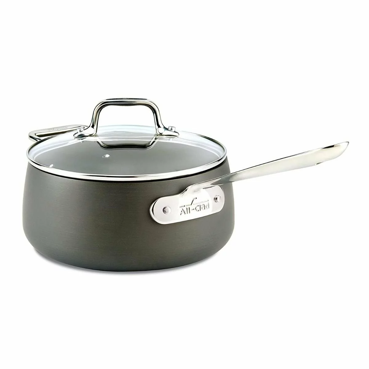 Stir and let simmer for a deliciously cooked soup, chili, or stew with this All-Clad HA1 Hard Anodized Non Stick 3.5 Qt Saucepan with Lid. This saucepan is made of hard anodized aluminum and a non-stick coating for easy cleanup. The shining stainless steel handles made it easier to hold onto the saucepan while transporting and cooking. With high, straight sides and a smaller surface area, the saucepan holds heat well and limits evaporation to accomplish that hearty flavor. Serve delicious comfort food to your family to warm both their hearts and their bellies with your new All-Clad HA1 Hard Anodized Non Stick 3.5 Qt Saucepan with Lid.