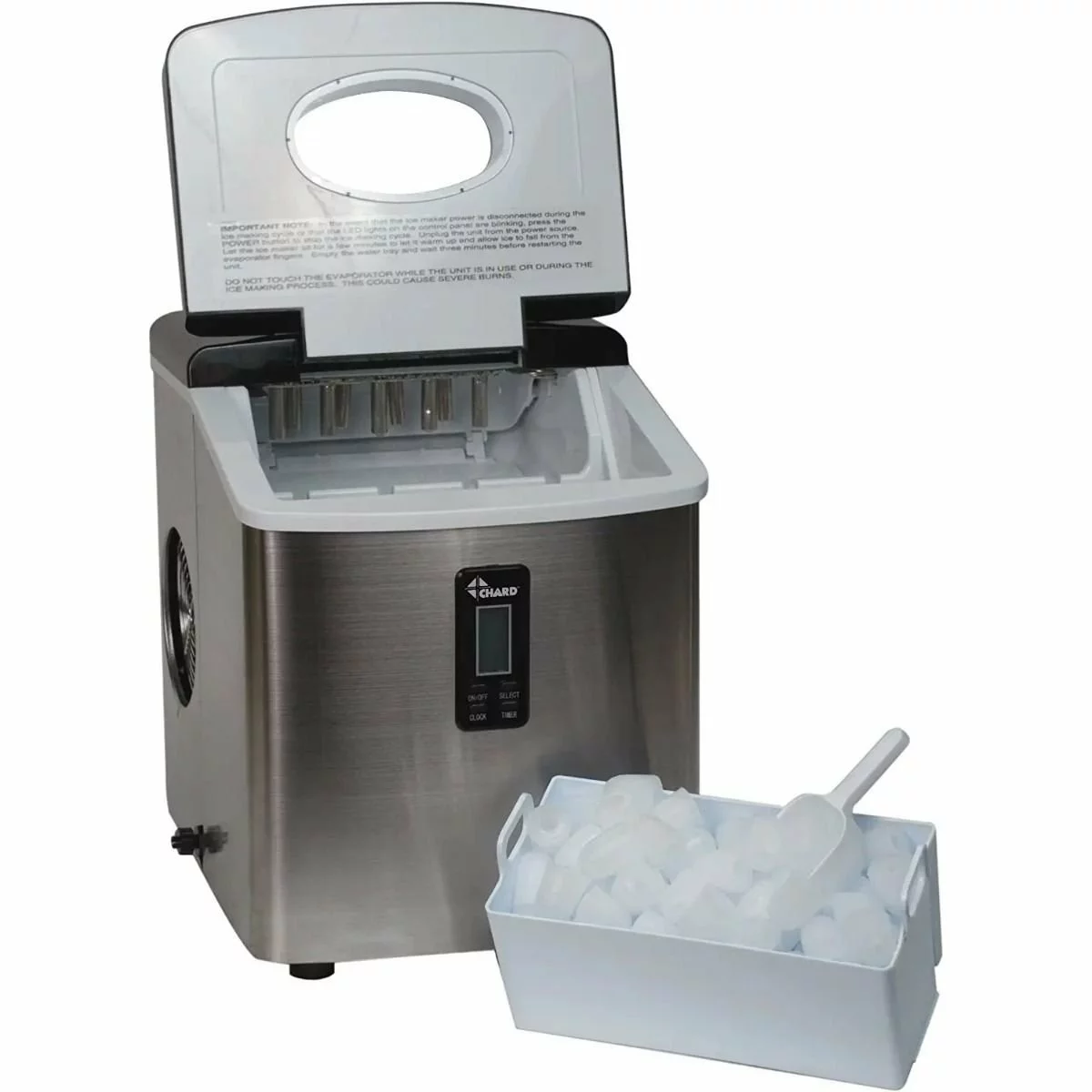 Have ice readily available whether you are at home hosting a party, in the break room at the office, or out at your cabin home by the lake for summer with the Chard Stainless Steel Portable Ice Maker. This portable unit is capable of producing a whopping 26 pounds of ice every day while its sturdy stainless steel body can be set anywhere conveniently in your home, office, or cabin. It features a simplistic soft-touch LCD screen that offers options for cube sizes from small, medium, and large, a programmable 19+ hour timer function so ice can be made when it is needed, and a helpful cleaning reminder. While the machine is portable, it’s important to note its removable bucket holds up to two pounds of ice and may rest on the countertop or patio/deck table for added convenience to fit any situation. When you are done making ice, the machine has a drain plug to remove the melted ice, making it easier to store away for later. Included with an ice scoop and operations guide, the Chard Stainless Steel Portable Ice Maker will help you stay chill under any circumstance!