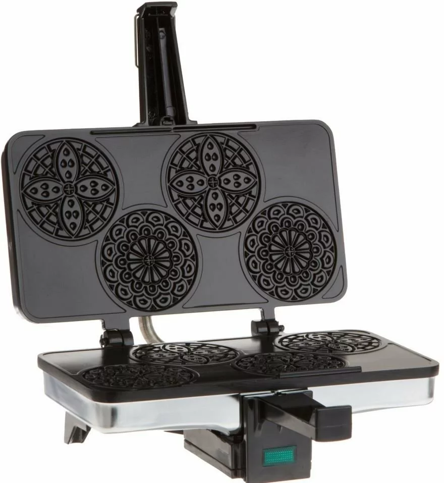 - Bakes 4 mini pizzelle cookies at a time (3.25” each)