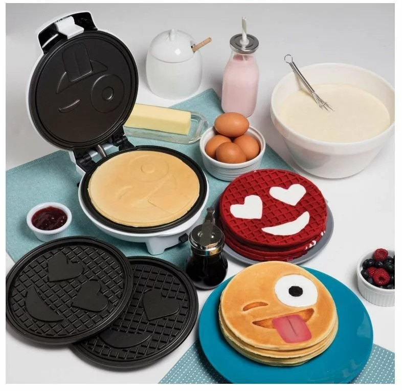 - Includes cooking plates to make heart-eyes emoji waffles or winking smiley face pancakes