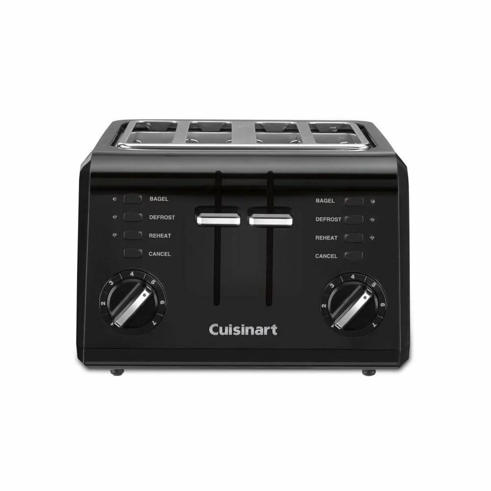 The Cuisinart Classic Toaster had room for improvement, so Cuisinart introduces the 4-Slice Compact Toaster in Black. Made from plastic and stainless steel, the toaster’s high-lift carriage works whether facing sideways or facing forward to fit anywhere in your kitchen. The generous slots accommodate up to two thick bagel halves and two slices of bread at once, toasted to your satisfaction with dual custom controls with seven different shade settings.