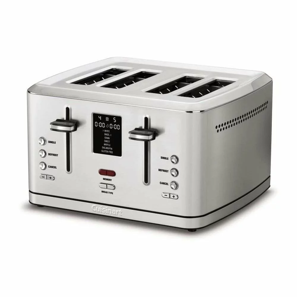 Bring your breakfast experience into the 21st century with the 4-Slice Digital Toaster from Cuisinart. With a sleek stainless steel design and large digital screen, this toaster has the convenience and versatility you need to ensure perfect results every time. Simply select from one of 7 bread types (White, Grain, Bagel, Sweet, Waffles, English Muffin & Gluten Free) and choose how light or toasted you want your bread using the digital screen. The large countdown timer indicates when your toast is done, and the high-lift lever makes it easy and safe to remove. With the unique MemorySet feature, this toaster will remember your preferred selection when you come back for more. For perfectly toasted cinnamon raisin bread, bagels spread with your favorite cream cheese, frozen waffles and more, order your Cuisinart 4-Slice Digital Toaster today!