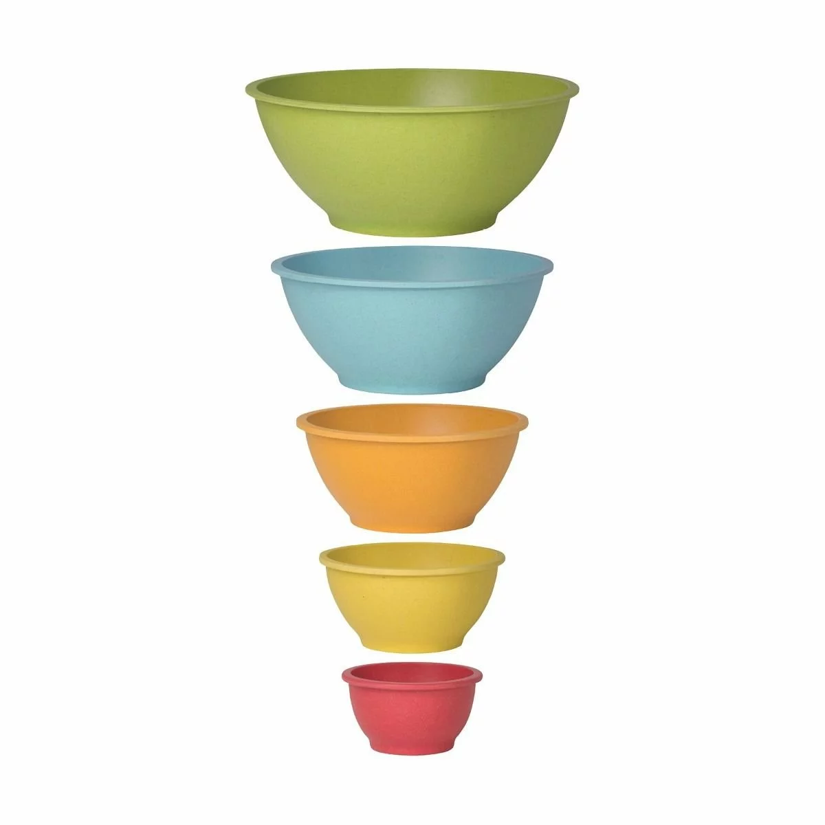 Make an eco-friendly addition to your kitchen with the Now Designs by Danica Planta Mixing Bowls (Set of 5) in Primary! Made from a blend of 60% food-safe melamine for durability and 40% recycled bamboo fibers for sustainability, this set of 5 mixing bowls is perfect for earth-conscious bakers when mixing recipes or home cooks when preparing and serving meals. The Primary color scheme includes classic color-wheel shades, adding a splash of color to your everyday food preparations. In varying sizes from small to large, the bowls neatly nest when not in use for organized storage and maximized cabinet space. The capacity of the bowls ranges from 3.8 Qt. at the largest to 0.3 Qt. at the smallest, allowing this set to work for recipes of any size! Take steps towards sustainability in your kitchen with the Planta Mixing Bowls (Set of 5) in Primary by Now Designs by Danica!