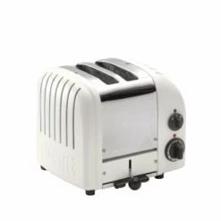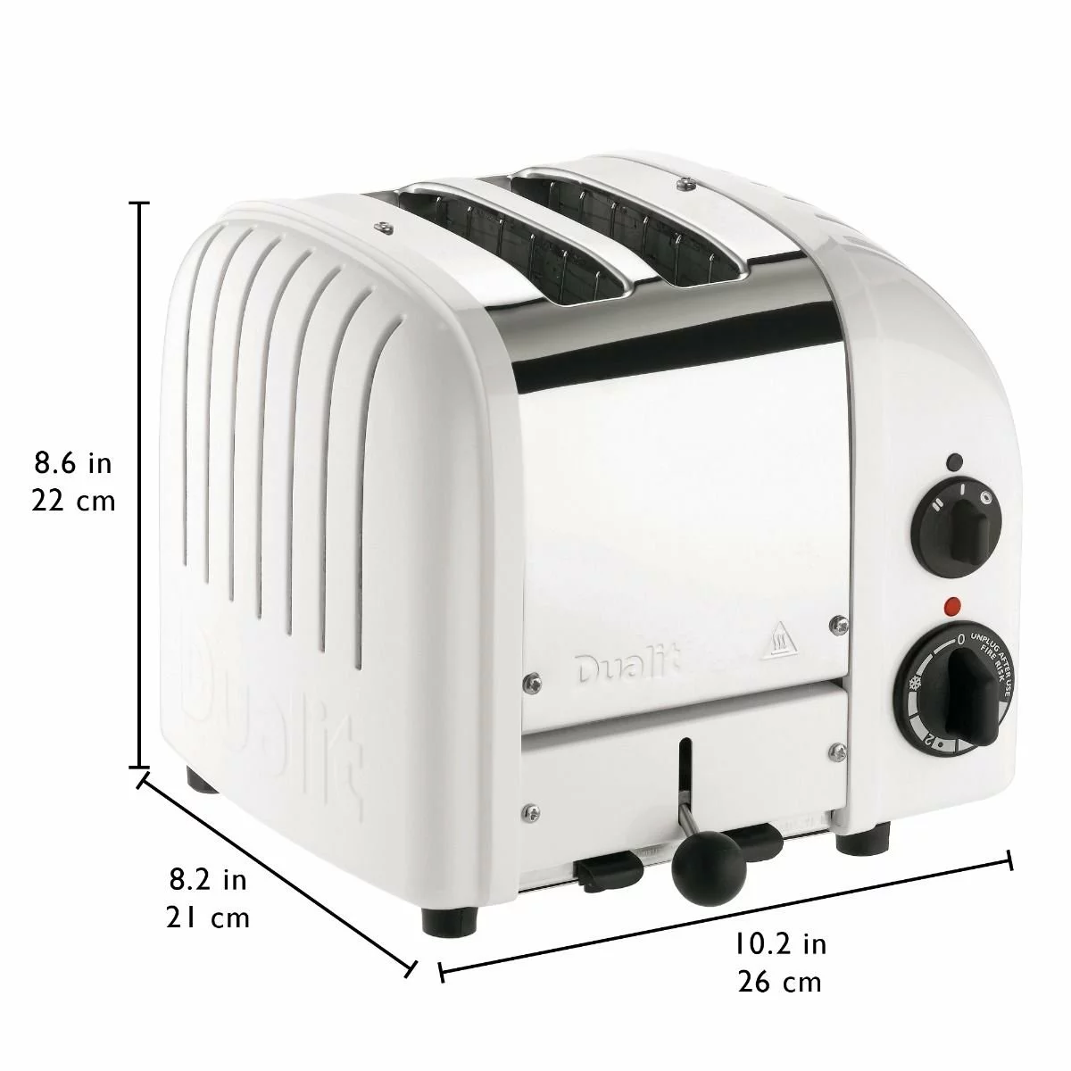 This Dualit NewGen White 2 Slice Toaster is Dualit’s most compact toaster and has extra wide 28mm slots. Each Dualit 2 Slice Toaster is hand assembled in the UK and built to combine sophistication and simplicity. Toast almost anything from a bagel, buns, muffins, to a sandwich. This Dualit Toaster is designed with award winning ProHeat elements (guaranteed for 2 years) to toast more efficiently and promote longevity. You can even use the selector control to heat either one or both slots. Manually operate the Dualit 2 Slice Toaster with an eject lever to keep items warm until needed. The Dualit Toaster comes standard with a removable crumb tray, mechanical timer, adjustable inner wire guard and an adjustable rear foot. The Sandwich Cage and the Warming Rack can be purchased as optional accessories.
