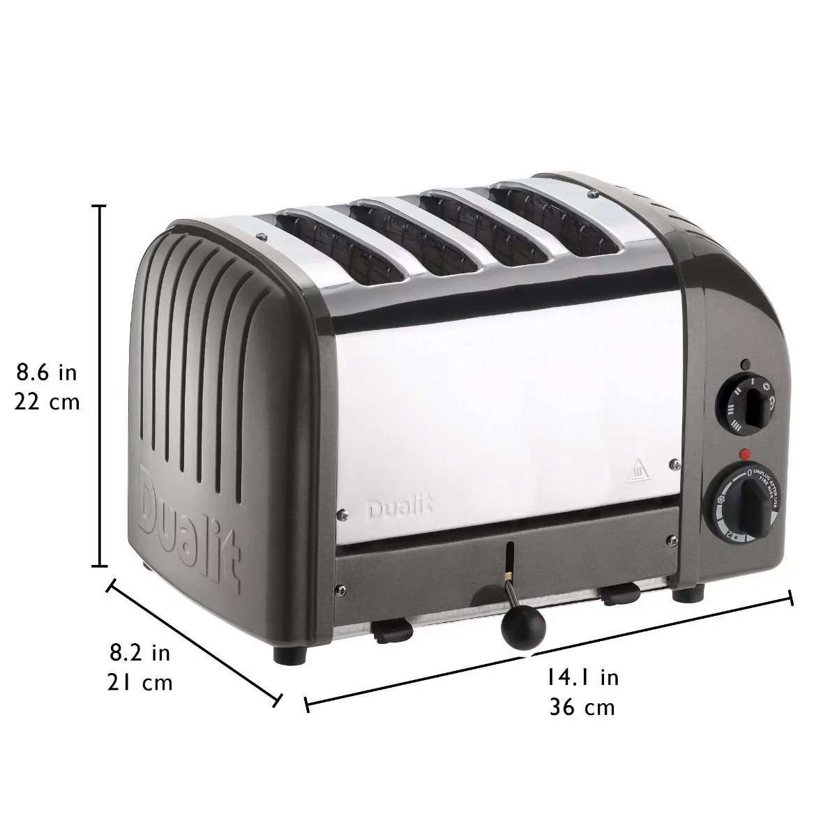 This Charcoal grey 4 Slice Toaster has the quality and style that you have come to expect from Dualit toasters. The ProHeat elements are an award winning Dualit patented design which increases toasting quality and longevity. With extra wide slots you can toast thicker breads, bagels, buns, or even sandwiches. This powerful and versatile toaster is designed for commercial use with the ability to toast up to 130 slices or bread per hour, but with the compact toaster design and bold, stylish stainless steel and Charcoal colors it is perfectly at home on you kitchen counter.