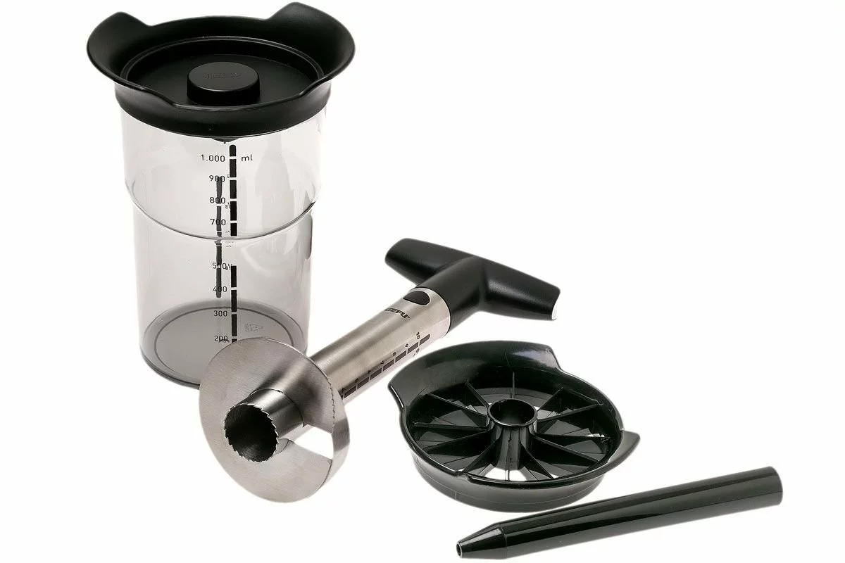 Extracting the succulent and sweet pineapple fruit from its skin is made simple with the Gefu pineapple slicer and corer. Simply turn the stainless steel corer blade to separate and slice the pineapple fruit from its rind. An etched scale on the pineapple slicer displays how many slices were extracted while a small chunk cutter attaches to the transparent container to collect the sweet treat. An included lid keeps fruit fresh for days and all components are dishwasher safe. Save money purchasing whole pineapple at the market and have confidence that the Gefu pineapple slicer and corer will leave you with the freshest of pineapple without the rind.