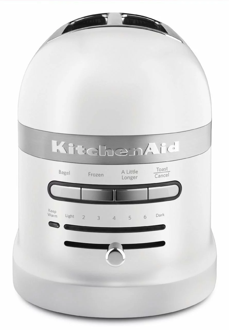 This KitchenAid Proline 2 Slice Toaster with Motorized Lift, in Frosted Pearl, offers a classic design with a die cast aluminum construction and chrome accents. The Kitchenaid Proline Toaster’s extra-wide slots will accept the thickest bagels, breads, or pastries. This 2 slot toaster offers multiple functions including keep warm, bagel, frozen,a little longer, and toast. The automatic sensor lifts and lowers toast into the toaster.