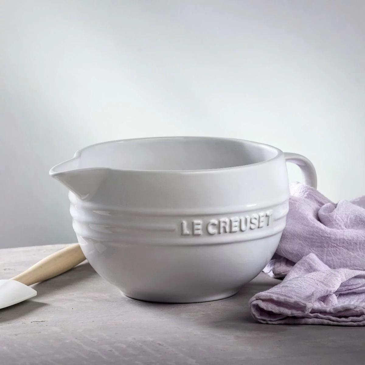 This 2 quart batter pitcher is perfect for mixing batters of all kinds from pancakes to waffles to cupcakes. Use this crisp clean white batter dispenser to fill up cupcake pans, skillets, and waffle irons with less drips and less mess thanks to its deep pouring spout and dishwasher safe enamel finish. The enameled finish gives the Le Creuset batter bowl added strength resisting scratching from metal and staining. Le Creuset Stoneware is hand crafted make each piece a one of a kind batter pitcher.
