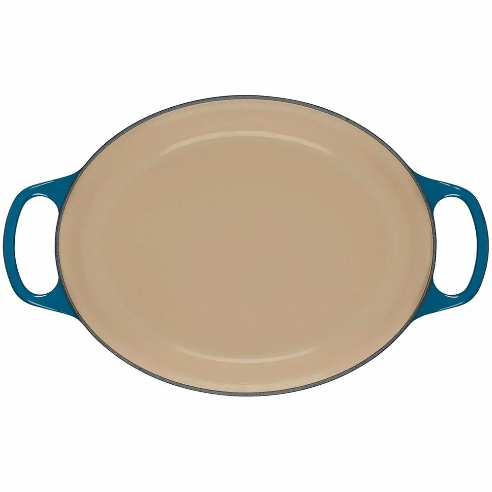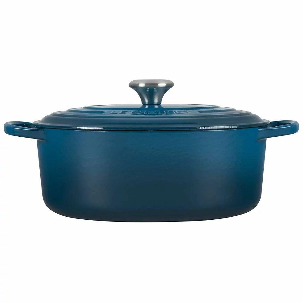 From slow-cooking hearty stews to roasting, braising, and frying meats & vegetables to baking homemade bread – the possibilities are endless with the Le Creuset Oval Signature Dutch Oven in Deep Teal! Made of Le Creuset’s time-honored enameled cast-iron that provides superior heat retention and even heat distribution to prevent hot and cold spots, this 6.75-quart Dutch oven includes a tight-fitting lid with a redesigned stainless steel knob that’s oven-safe up to 500°F, allowing for a seamless transition from stovetop to oven. Finished in Le Creuset’s rich and sophisticated Deep Teal glaze that’s chip, scratch, and shock-resistant, this Dutch oven will become your favorite cooking vessel for all of your culinary endeavors!