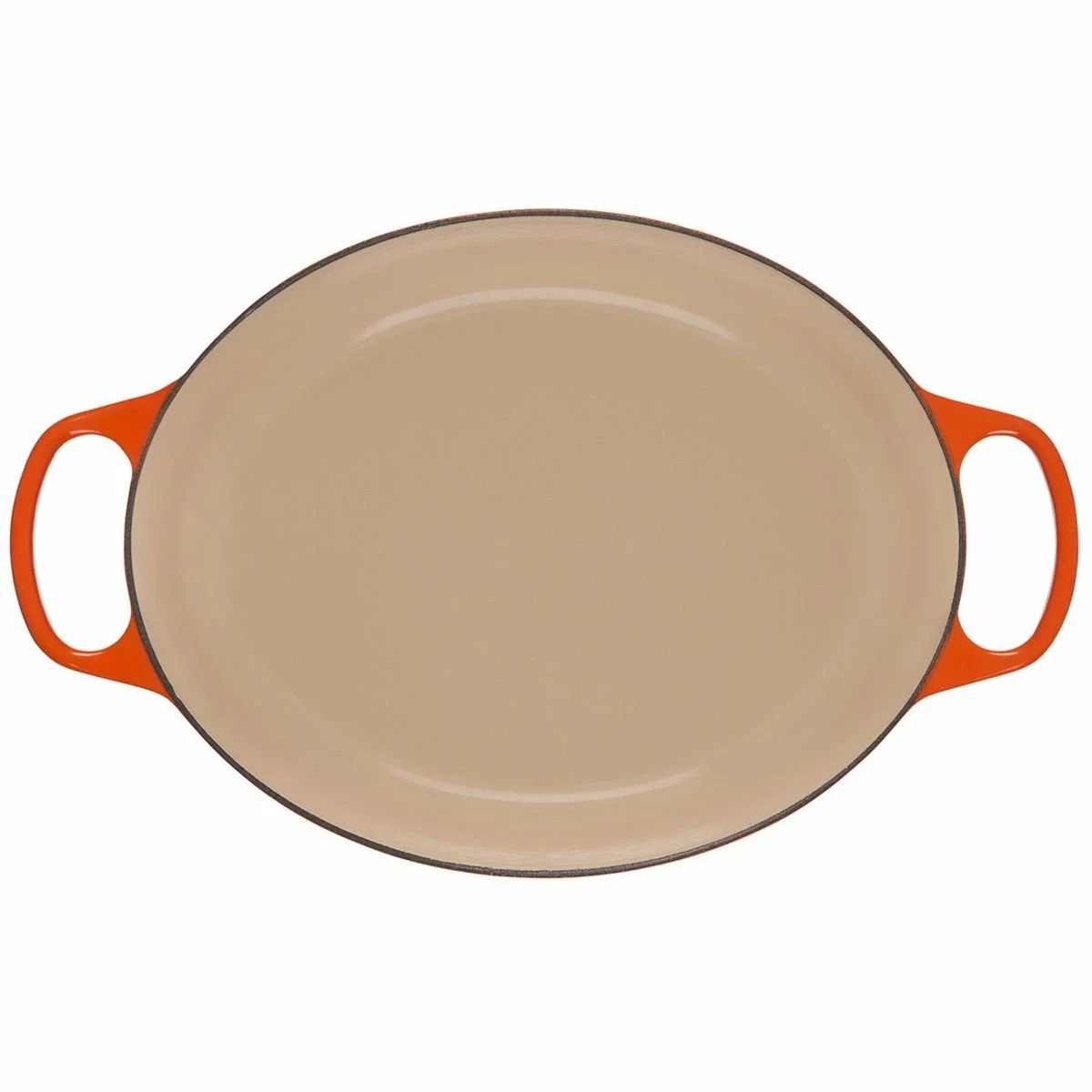 This 6.75 Quart Flame Orange Le Creuset Oval Dutch Oven can handle the longest pork loins, full-sized pit hams, whole poultry, and more with ease! The Le Creuset Signature cast iron Dutch oven construction retains and radiates heat in such a way that your food will be come out fork-tender and delicious every time. Make party-sized portions of casseroles, soups, stews without worry you will run out of food. This oval Dutch oven also makes great serveware for cold foods! An investment into a Le Creuset Oval Dutch Oven will pay for itself over and over during a lifetime of use. No matter how you decide to use this Signature Enameled Cast Iron Le Creuset Flame Orange 6.75 Quart Oval Dutch Oven, you can be absolutely thrilled with the final, fabulous results.