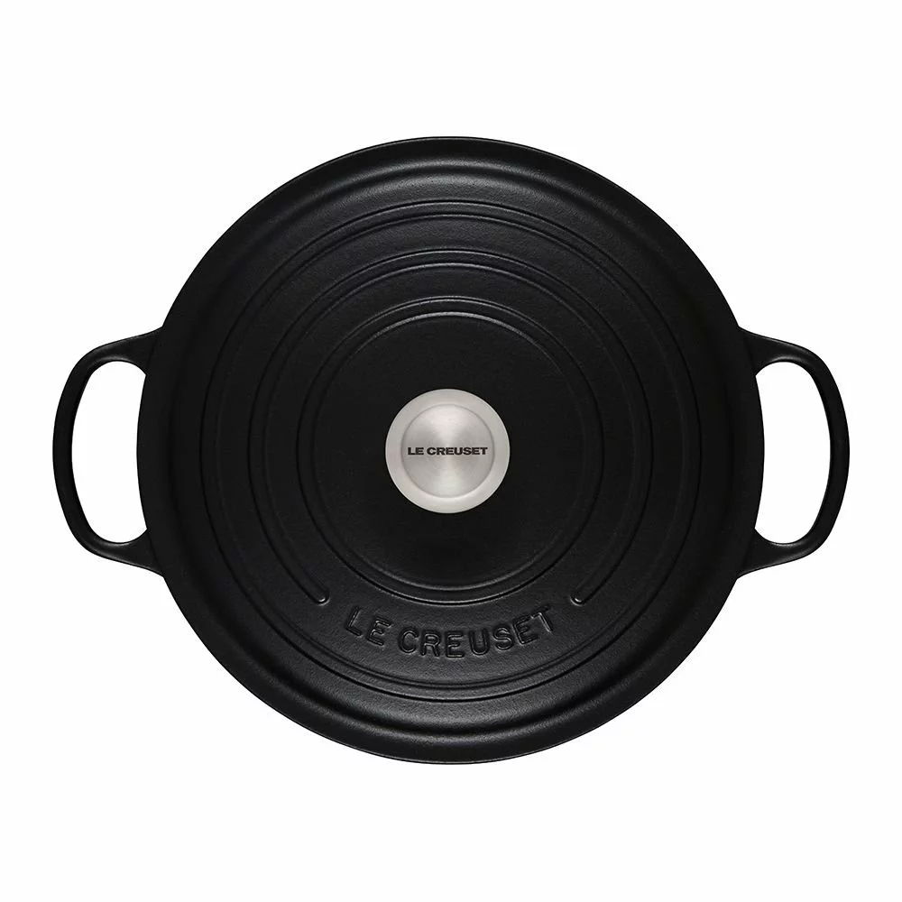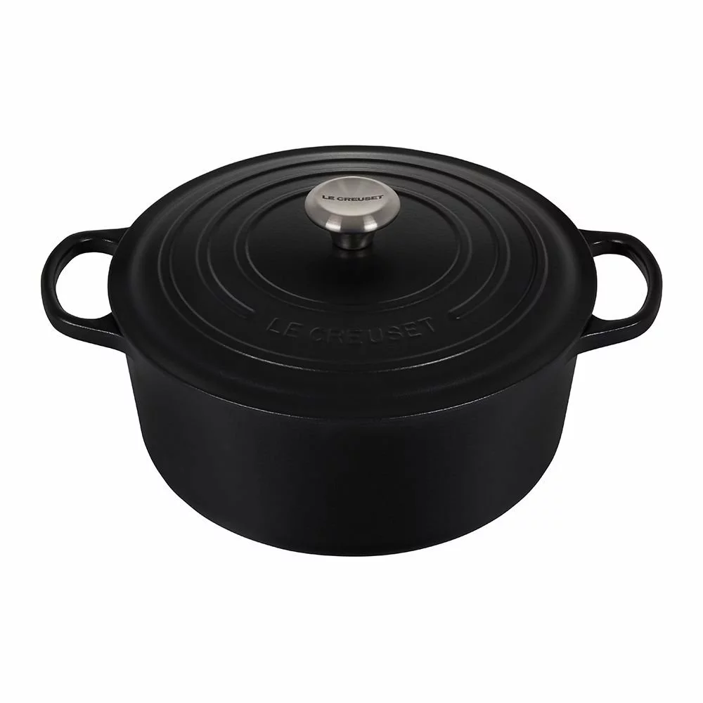 Bring the family running to the table with a mouthwatering pot roast slow-cooked in the Le Creuset 7.25-Quart Signature Round Dutch Oven in matte Licorice! The modern textured design & sleek sophisticated matte black finish coordinates well with other Le Creuset cookware pieces in the Licorice Collection or mix & match with any other Le Creuset color collection for a bold look. Prized by home cooks and professional chefs alike, nothing beats durable cast iron for braising, roasting, and slow cooking, thanks to its even heat distribution and exceptional heat retention. The smooth, sand-colored enamel interior promotes caramelization, prevents food from sticking, and resists stains. The dome-shaped lid provides a continuous circulation of heat and moisture which locks in flavor.