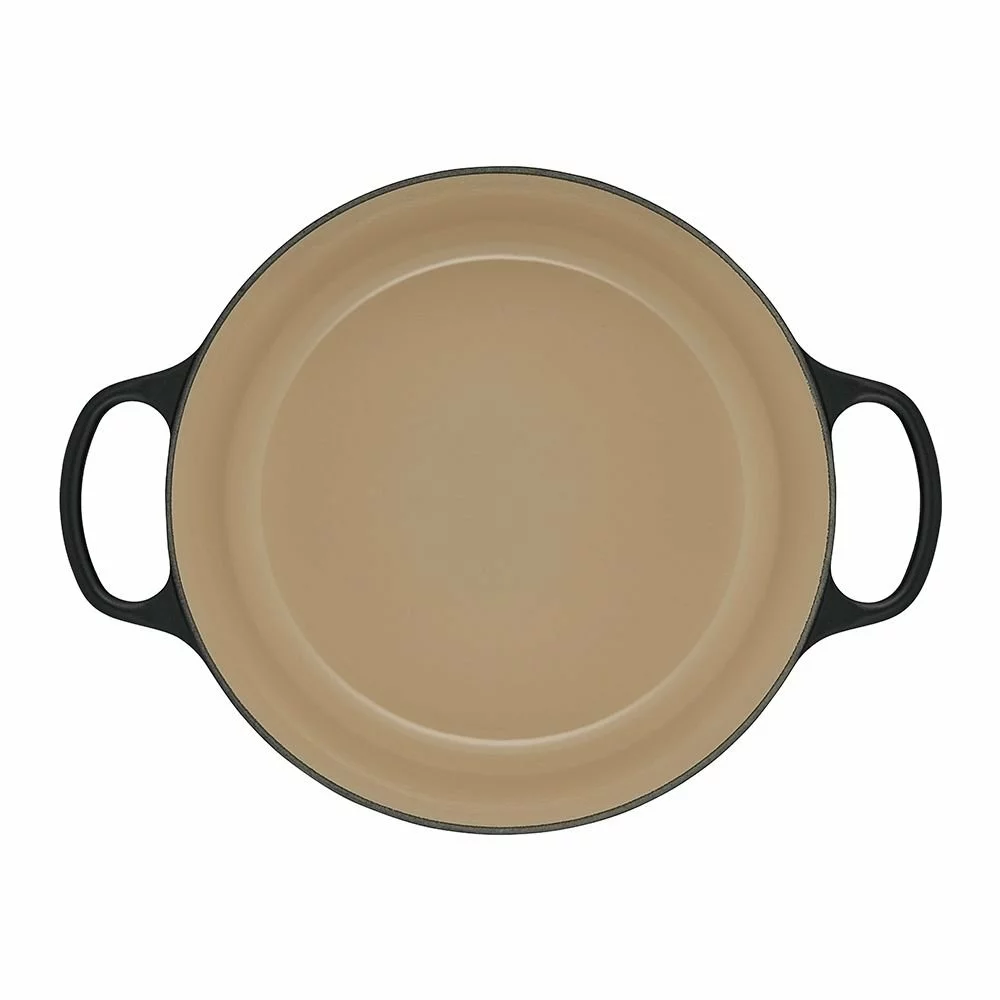 - Interior sand-colored enamel has a smooth finish that promotes caramelization while it prevents sticking and resists staining