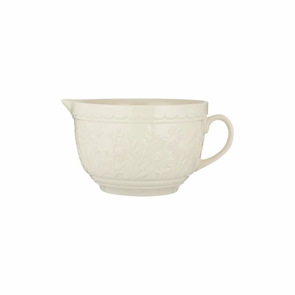 Bring the effortless charm of lush countryside fields indoors with the Mason Cash In The Meadow Collection Batter Bowl. Made with Mason Cash’s time-honored stoneware that is resistant to chipping and cracking, this bowl will be a durably elegant addition to your everyday baking preparation. With a 2 Qt capacity and a convenient handle and spout, this mixing bowl makes it easy to prepare and pour thinner mixtures, such as cheesecake filling, cake batter, brownie batter, and more. The soft cream coloring is highlighted with an embossed wildflower design that lines the bowl’s perimeter, while the classic scalloped rim offers maximum grip – making for a practical, elegant piece that will let mixing tasks go smoother. Let your baking tasks bloom with style and order the Mason Cash In The Meadow Batter Bowl today!
