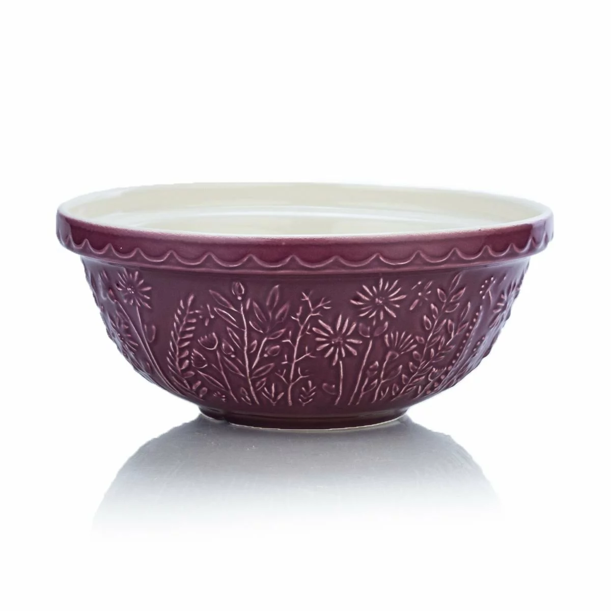 Bring the effortless charm of lush countryside fields indoors with the Mason Cash In The Meadow Collection S18 Mixing Bowl in Daisy. Made with Mason Cash’s time-honored stoneware that is resistant to chipping and cracking, this mixing bowl will be a durably elegant addition to your everyday baking preparation. With a 2.85 Quart capacity, the S18 mixing bowl is ideal for preparing single batches of dough or batter or for serving side dishes. The deep purple-hued maroon coloring is highlighted with an embossed Daisy design that lines the bowl’s perimeter, while the classic scalloped rim offers maximum grip – making for a practical, elegant piece that will let mixing tasks go smoother. Allow your baking tasks to bloom with style and order the Mason Cash In The Meadow Mixing Bowl today!