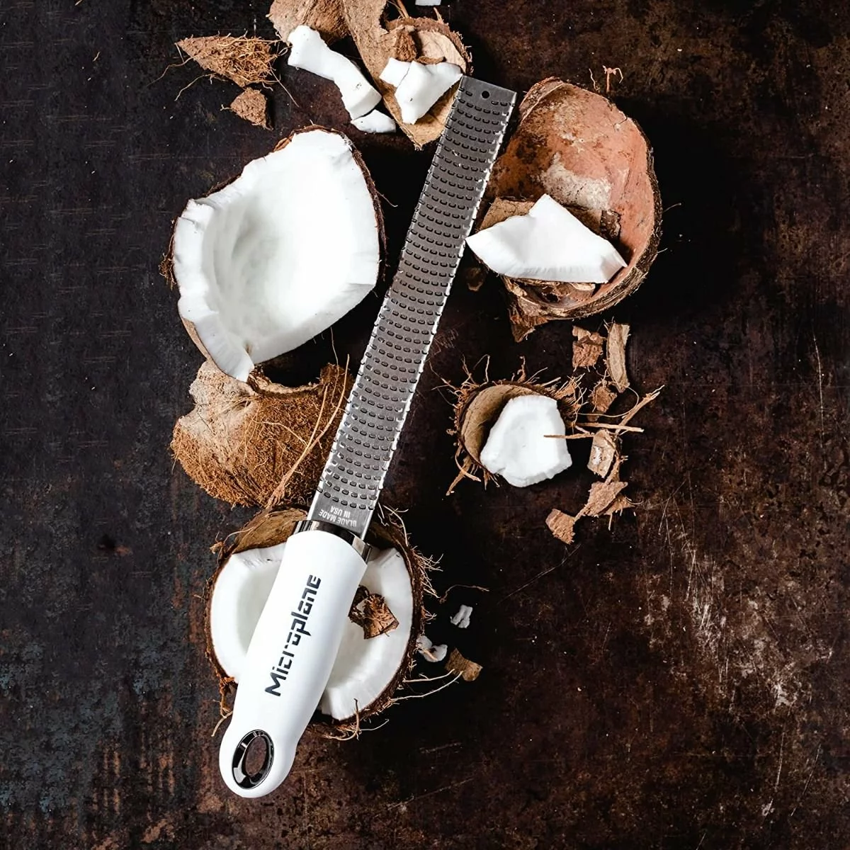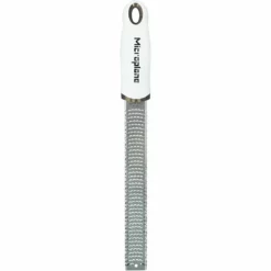 The Microplane Premium Series Zester & Grater White has moved from the workshop to the kitchen. The iconic long, narrow rasp-style design is made of a surgical grade stainless steel blade with a comfortable soft-touch handle and non-scratch end tabs to grate even the hardest Parmesan Reggiano cheese. Hold the lemon in one hand and the Zester with the side up as if it were the neck of a violin. The zest collects in the upper channel with lacy fine shavings of zest–no more grated knuckles!