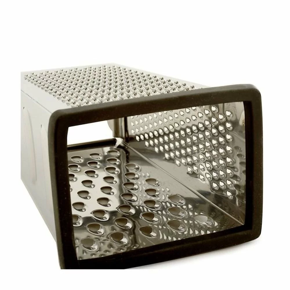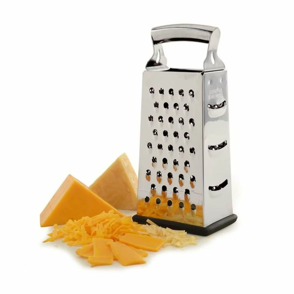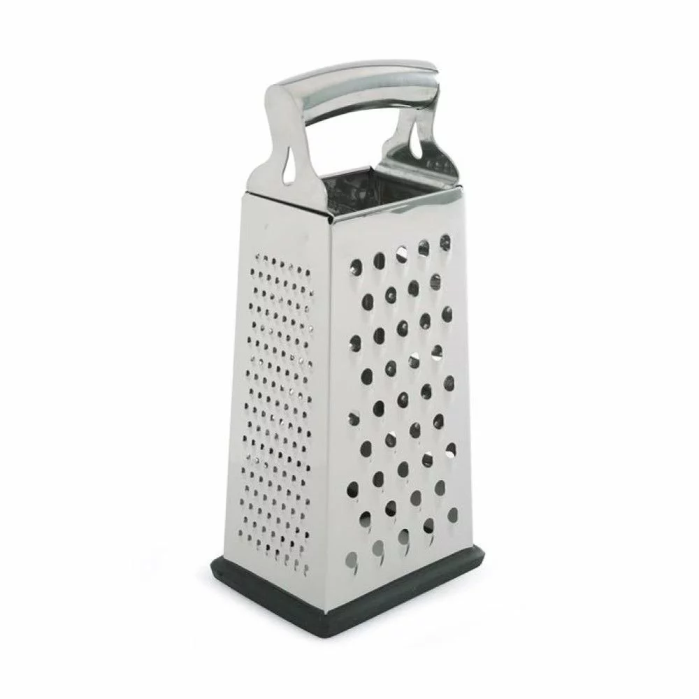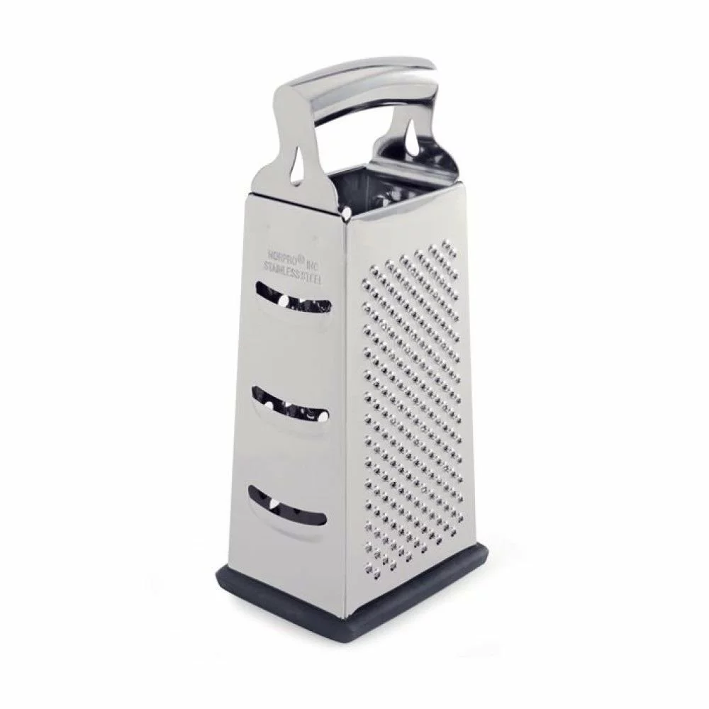 Zest, peel, and grate however you like with the Norpro 4-Sided Box Grater! Made from stainless steel, this box grater has fine, medium, coarse, and sliding surfaces for various jobs. Use the fine grating surface for lemon zest, the medium grating surfaces for garlic and ginger for soups and stir-fries, the coarse grating surface for breaking down firm cheese, and the sliding surface for making potato chips or slices of squash for the ultimate ratatouille. The bottom rim of the grater is covered with a silicone material that protects the surfaces underneath and makes it nonslip for safety while holding it firmly with its comfortable handle. When you are done using the grater, wash it by hand only and dry it immediately to maintain it properly for future use. So let yourself zest, peel, grate, and slide all day with the Norpro 4-Sided Box Grater!