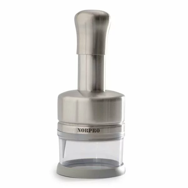Throw together a stir fry, taco bar, salads, or soups with this Norpro Stainless Steel Chopper! This chopper will make short work of chopping chores such as onions, peppers, and other vegetables. The blades rotate 60° after each time the knob is depressed, evenly chopping items. The two rotating blades keep food off the sides while chopping for an even mix. The storage cup comes with a lid so you can store the ingredients for the next meal’s recipe. All of the parts come apart for easy cleaning so that it is not just easy to use, but easy to clean as well. Create a yummy blend of fruits or veggies for a myriad of recipes with your new Norpro Stainless Steel Chopper!