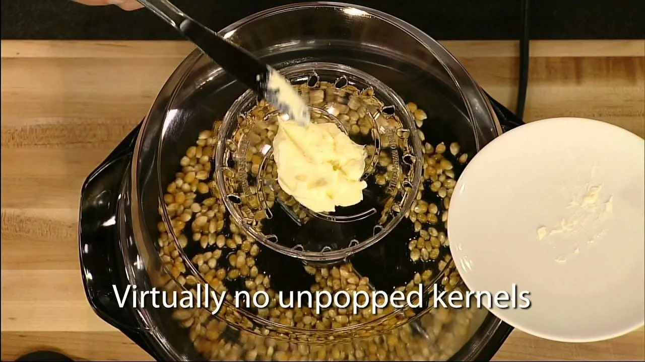 - Built-in melter distributes butter over corn while it pops
