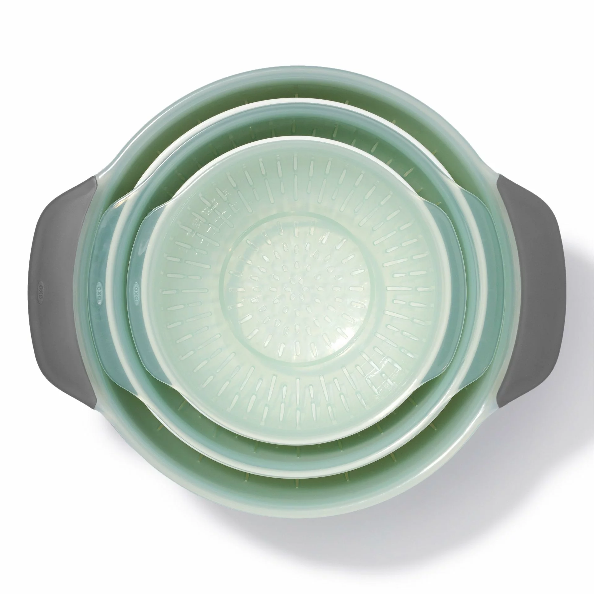 Each mixing bowl features a non-slip base for stability while mixing or sitting on the counter to prevent messes and accidental spills. Each colander is designed to fit snugly inside the mixing bowls and has a wavy base and elongated drainage holes for quick and efficient draining. This set also comes with clear flat lids, so you can store your cookie dough, fruits, pasta, and other foods in the fridge until ready to use! Plus, this set of bowls and colanders nests for convenient storage, saving you precious cabinet space. Say goodbye to mismatched bowls and colanders and hello to a clutter-free kitchen with the OXO Good Grips Bowls & Colanders Set today!