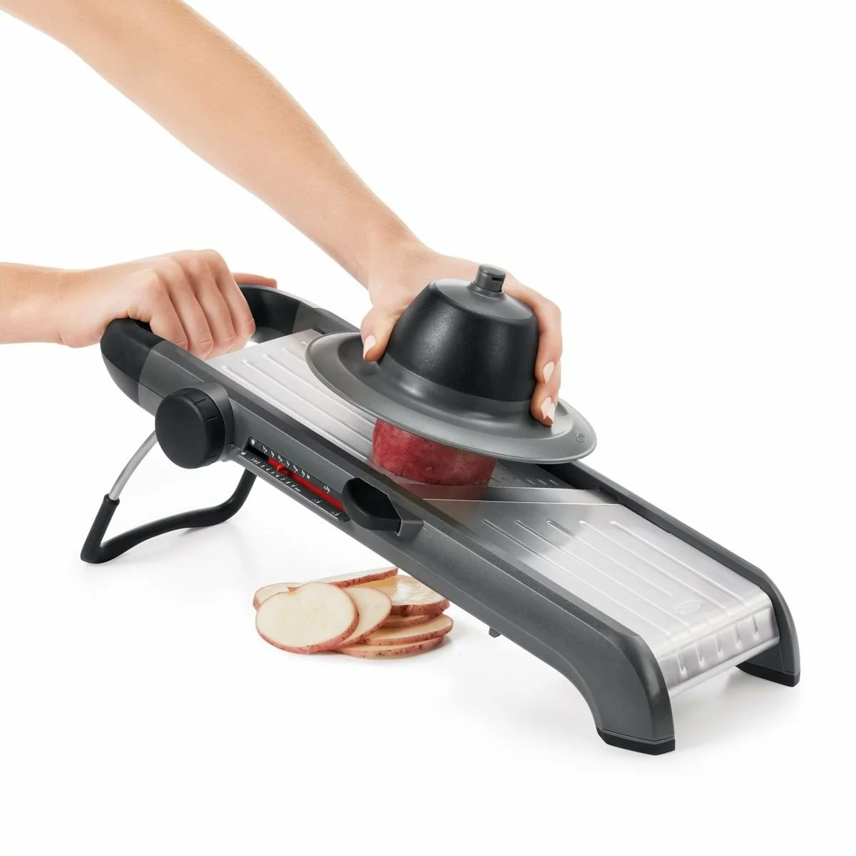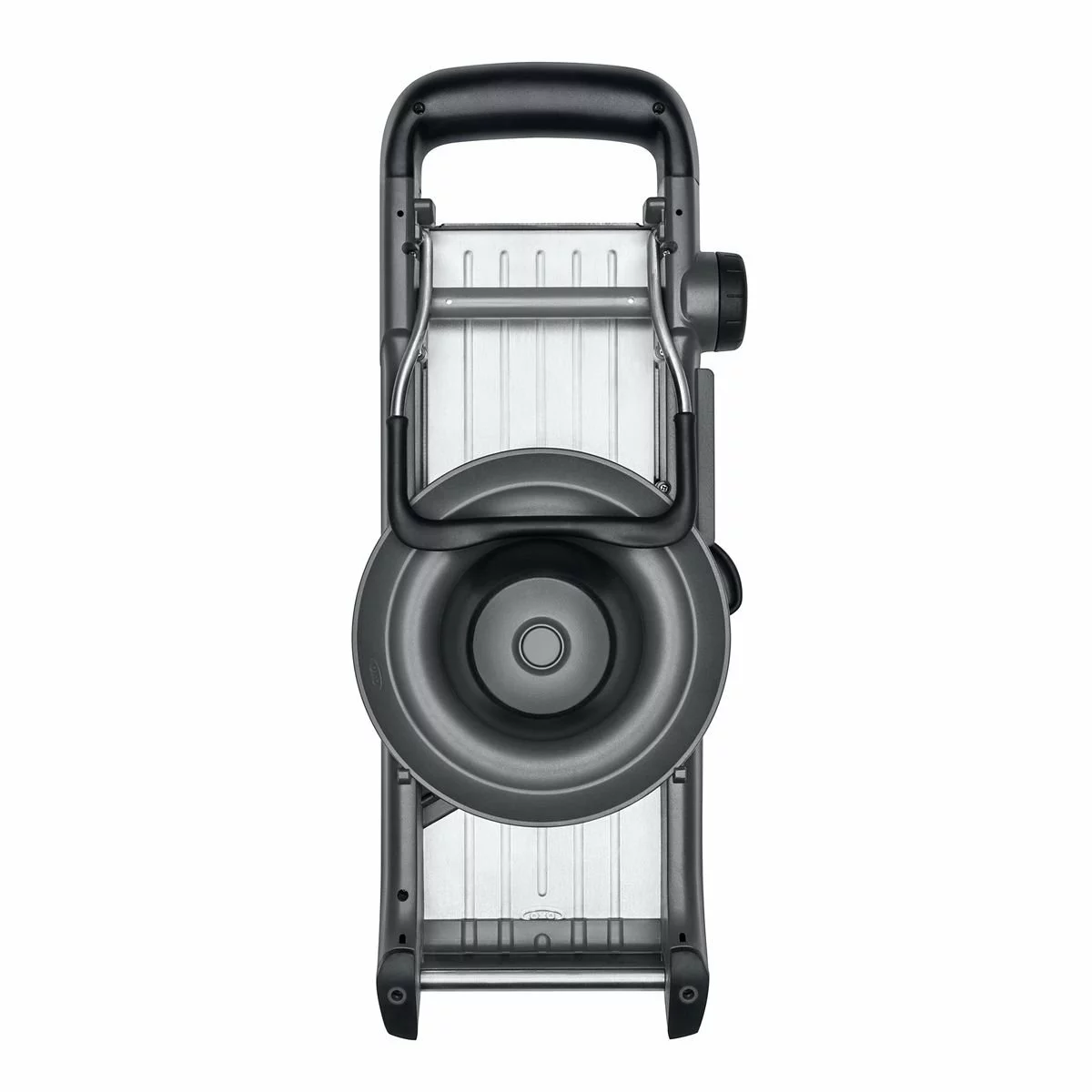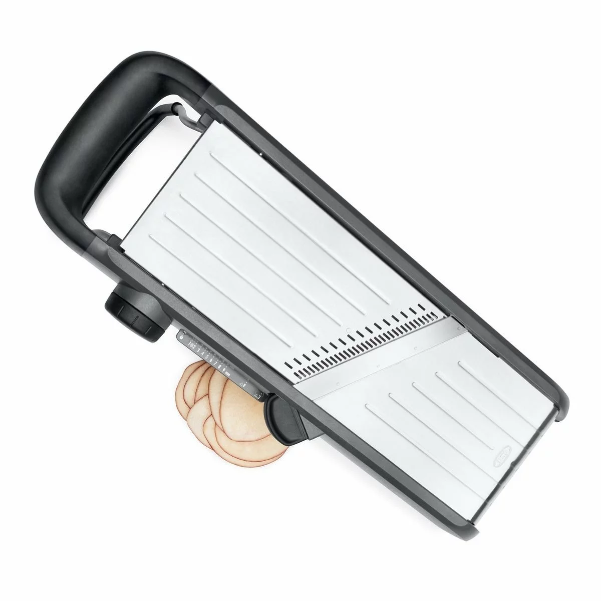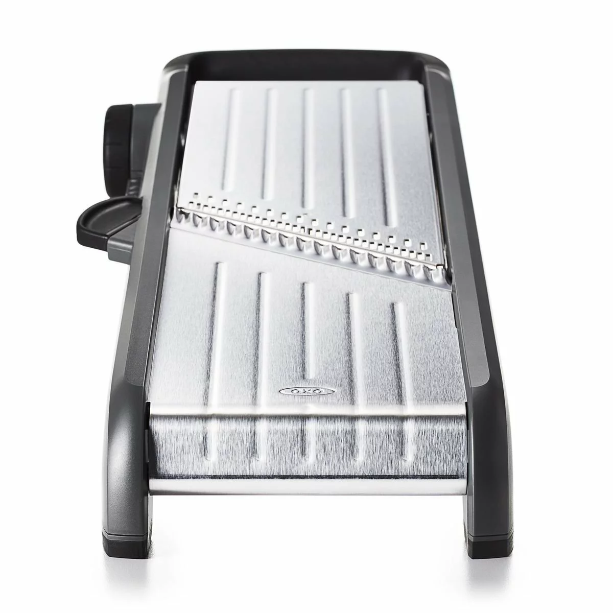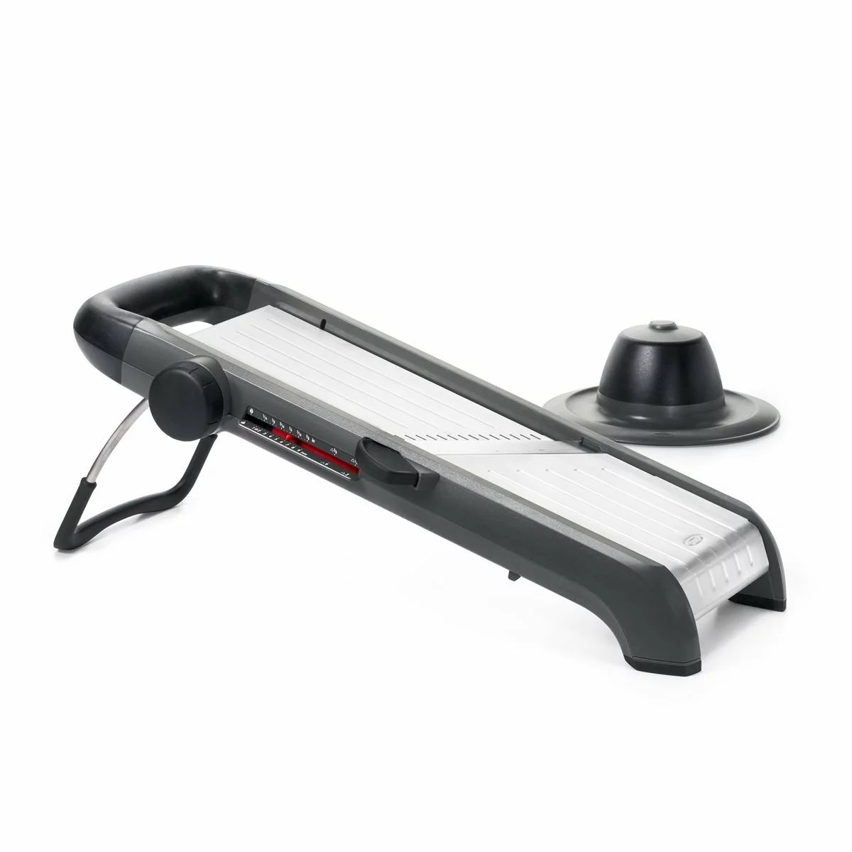 Masterfully prep any ingredient with the OXO Good Grips Chef’s Mandoline Slicer 2.0! With an astounding 21 different cut options, including straight and wavy, julienne, and french fry blades, this mandoline is a true multi-tasking tool. An indicator window gives you a view of the settings from above, making it easy to pick the right one. Bring home the Chef’s Mandoline and you won’t need professional knife skills to make matchstick carrots, thin slices of fruit for a tart, or mounds of paper-thin potatoes for homemade chips!