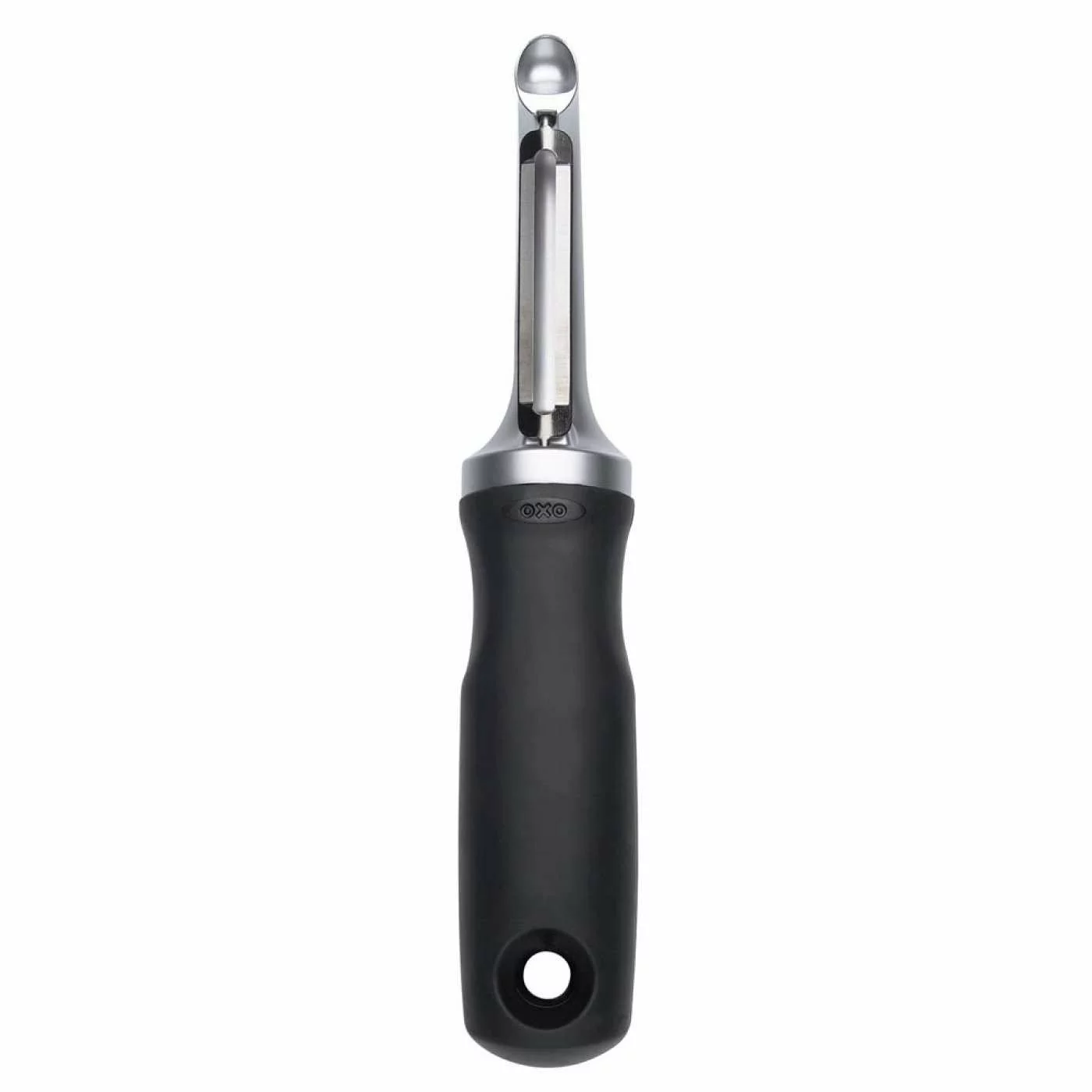 Make quick work of peeling all types of fruits and vegetables with OXO’s Pro Swivel Peeler. The premium details make for faster, more efficient peeling with this smartly-designed kitchen necessity. It’s constructed from sturdy die-cast zinc and features a precision-ground, extra-hardened stainless steel blade for durability and efficiency. The soft, nonslip grip is comfortable in your hand so fatigue won’t set in when you’re midway through a mound of potatoes. It even includes an eyer to remove blemishes from produce. Add this Pro Swivel Peeler to your kitchen tool chest and you won’t have to dread the peeling prep work!