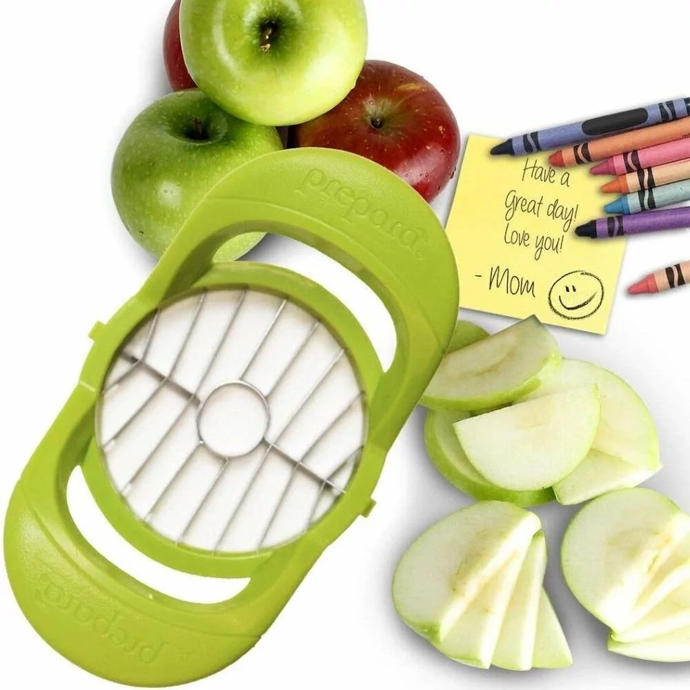 Whether you’re packing lunches, making desserts, of just adding some flavor to the water pitcher, apple slices are a great addition! Take the hassle out of slicing apples with the Apple Splitter from Prepara! The apple splitter features strong, durable plastic construction with a stainless steel blade. The ergonomic, incredibly easy-to-use design makes chopping up apples easy. Simple stand up an apple, align the splitter over it, then press down onto the two comfortable handles and you’ll have slices in no time and a completely removed core! This compact apple splitter can then go right back into the drawer or cabinet while you focus on cooking. No need to worry over the apple slices any further! Depending on the size of the apple, you could have up to 18 evenly cut slices with one simple press! It’s not just a great apple tool, either, but also looks fantastic in any kitchen- featuring a stylish green finish. When you’re done with this handy tool, it’s top-rack dishwasher safe, so cleanup is hassle free. Don’t struggle with a knife trying to get even apple slices! Order your very own Prepara Apple Splitter today!