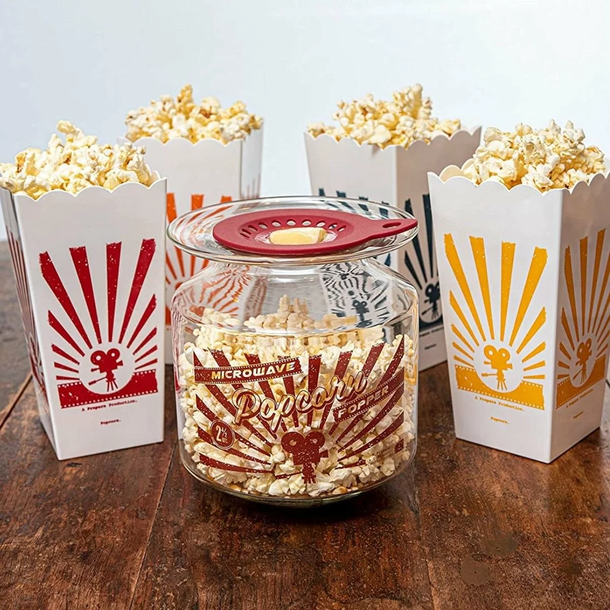 Family movie night is approaching- but movies just aren’t the same without popcorn. You have kernels, but you don’t want to drag the big popcorn machine out of storage. Pop those kernels in the microwave with ease with the Popcorn Popper Gift Set from Prepara! All you have to do with this popper is load it up with kernels and stick it in the microwave, and in a short three to five minutes, you’ll have perfectly popped popcorn ready to eat. Constructed of highly durable borosilicate glass and featuring a heat-resistant silicone lid, this popper is made to last and withstand daily use! The silicone lid is for more than just trapping heat, too. It also functions as a butter melting tool for getting liquid, golden butter to drench those hot kernels. This popper will make up to approximately 2.5 Quarts of popcorn at a time, which you can dispense into the included, classic popcorn bag styled boxes, other bowls, or just eat straight out of the popper! This popper looks great, too, featuring old-fashioned, bold red lettering and matching red finish on the lid. The boxes likewise are modeled after movie theater popcorn bags- perfect for a movie party! And when you’re done using it, this popcorn popper is dishwasher safe for easy cleanup. So pop those kernels, melt that butter, throw some salt on top and you’re all set for movie night in a matter of minutes. Order your very own Prepara Popcorn Popper Gift Set today!