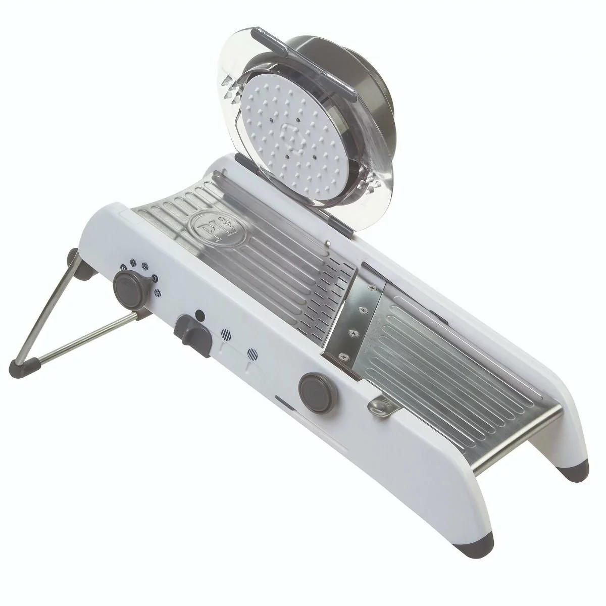 - Extra-wide stainless steel slicing deck allows food to glide easily with the safety hand guard