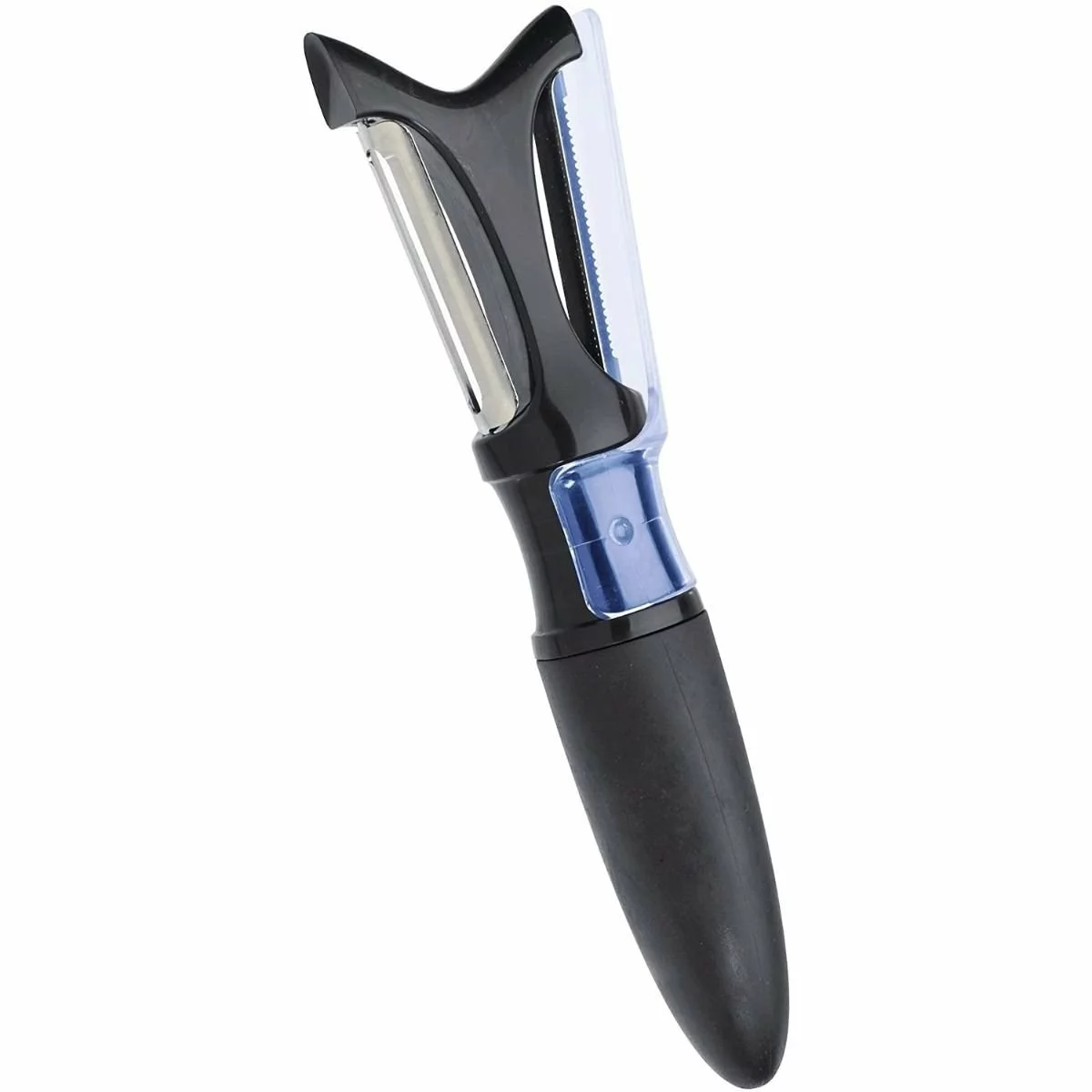 - Dual blade peeler: serrated for soft skin produce, straight for hard skin produce