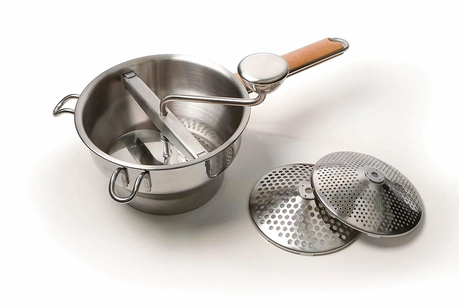 The RSVP Endurance stainless steel food mill is non-reactive and hygienic 18/8 stainless steel and comes with 3 stainless steel disks in fine, medium, and coarse. Perfect for making smooth apple sauce or chunky tomato sauce, baby food or fluffy mashed potatoes. The rests will hold the mill steady while you crank the blade.