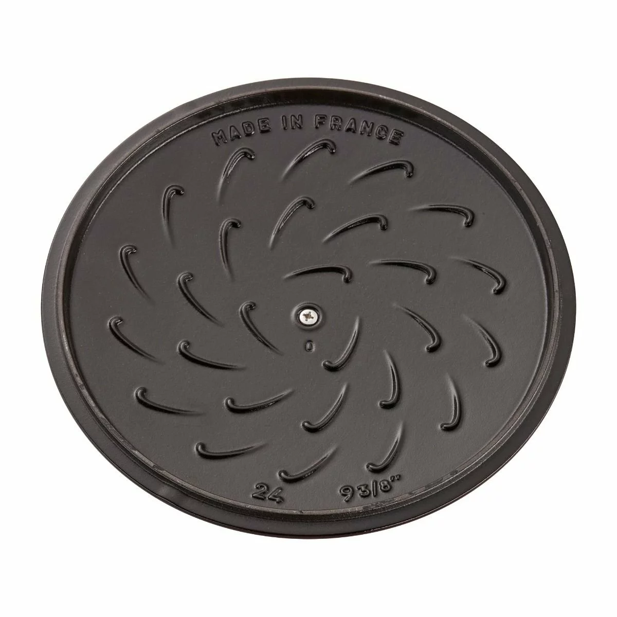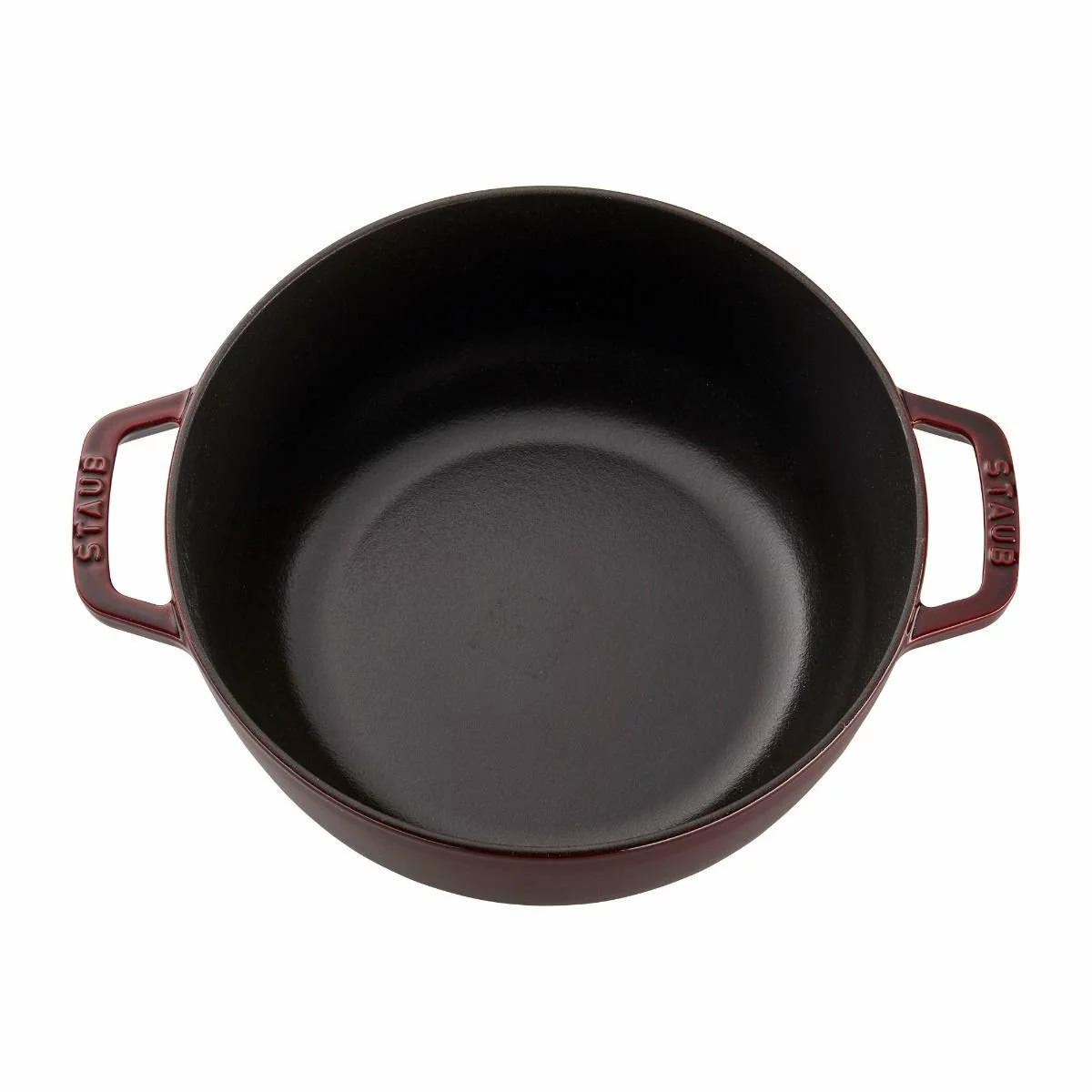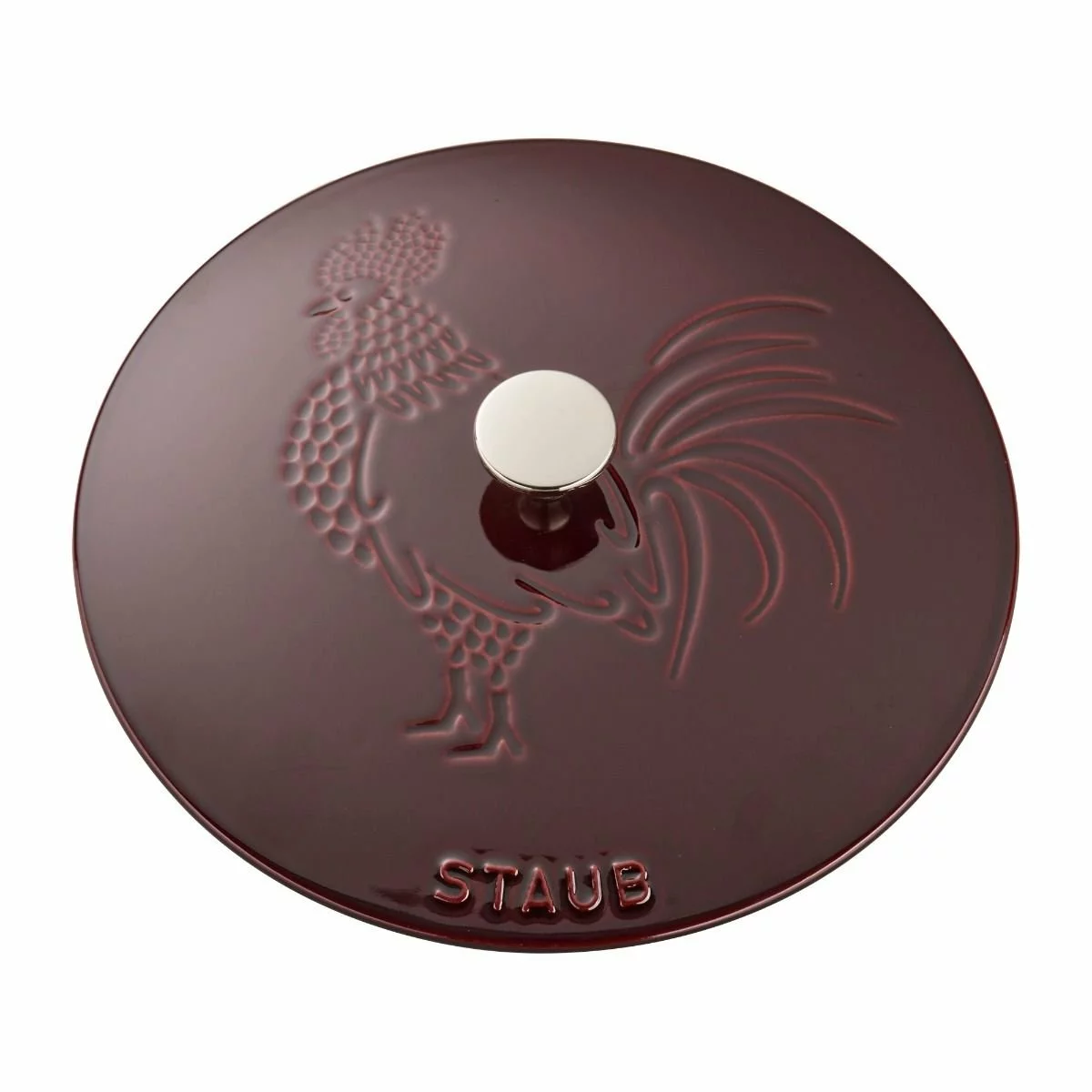 Cook hearty stews, savory casseroles, or delicious cobblers with Staub’s Essential 3.75 Qt Grenadine Cast Iron Rooster Cocotte/Dutch Oven! The traditional round design paired with a lid that has built-in Chistera spikes enables self-basting to continuously keep food moist. The easy-to-clean cast iron cookware distributes and retains heat and does not require seasoning. The matte black enamel interior heats and enhances caramelizing and is excellent for searing. The lovely rooster engraved on top is the perfect touch of character for your kitchen. Try your hand at ratatouille, risotto, or roasts in your very own Staub Essential 3.75 Qt Grenadine Cast Iron Rooster Cocotte/Dutch Oven!