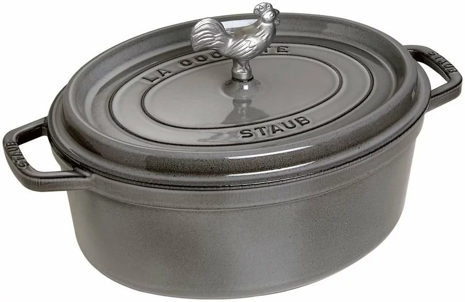 Bring your family together with hearty roasts and soups with the Staub Oval Cocotte also known as a French or Dutch Oven. Crafted from strong, durable cast iron this heavy weight dutch oven will be your go to cookware for numerous family favorite recipes including but not limited to macaroni and cheese, braised beef and chocolate souffle. The tight-fitting lid retains essential moisture and features Self-Basting spikes that contribute to a more effective basting while you’re cooking. The smooth enamel bottom works on all stovetops and is oven safe up to 500 degrees Fahrenheit. With no seasoning needed you can start making dinner meals and desserts everyone will love. The fantastic graphite grey color and chip-resistant finish makes for a perfect centerpiece while serving and with a lifetime warranty you can expect to have this wonderful Staub Oval Cocotte/Dutch Oven to pass down to generations in your family.