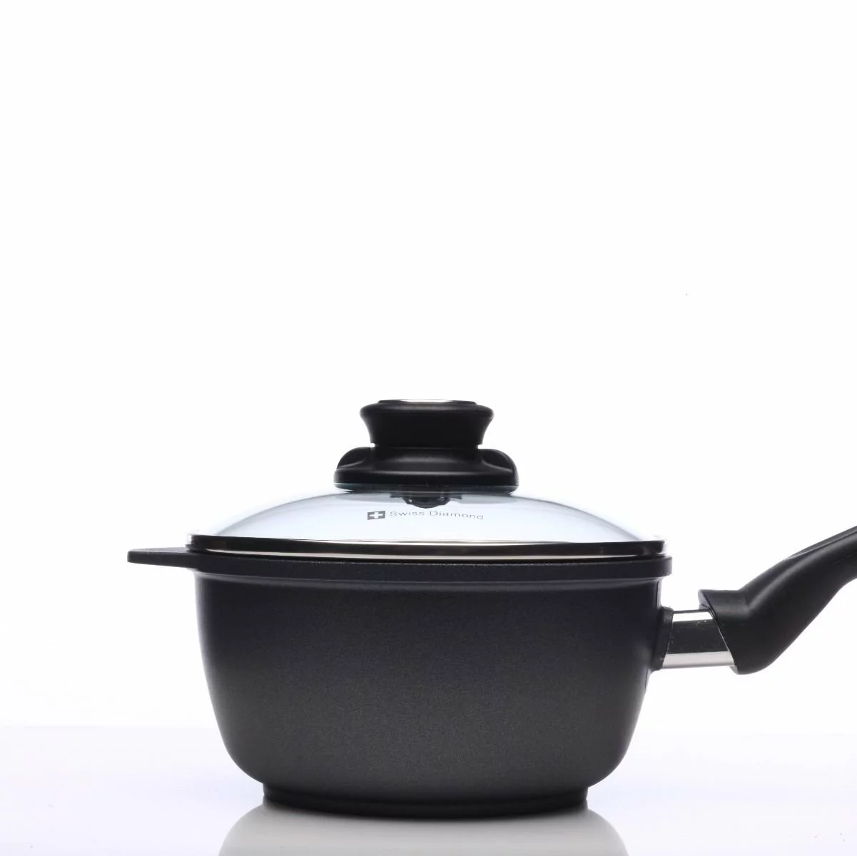 The small sized 1.4 Qt. Covered Swiss Diamond Pan 6716 is perfect for those special sauces, soups, and gravies. It has a vented metal-rimmed heat-tempered glass cover.